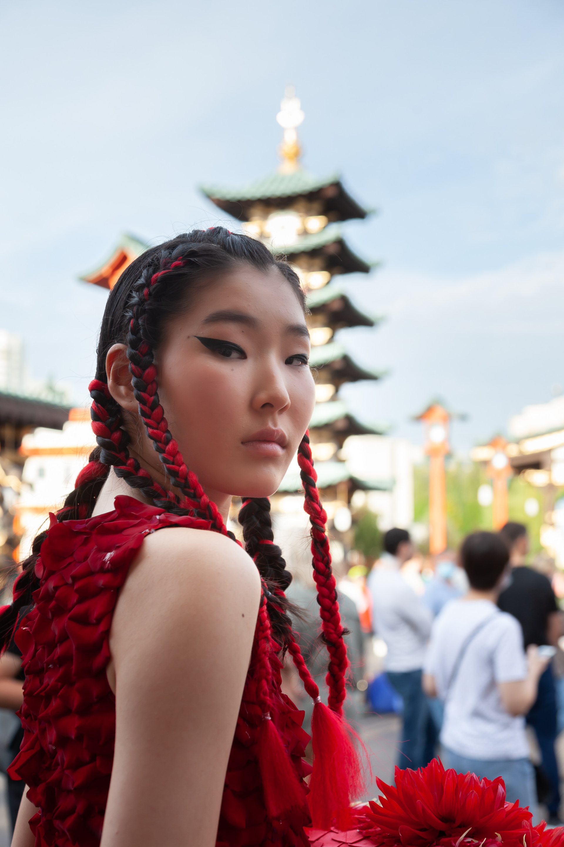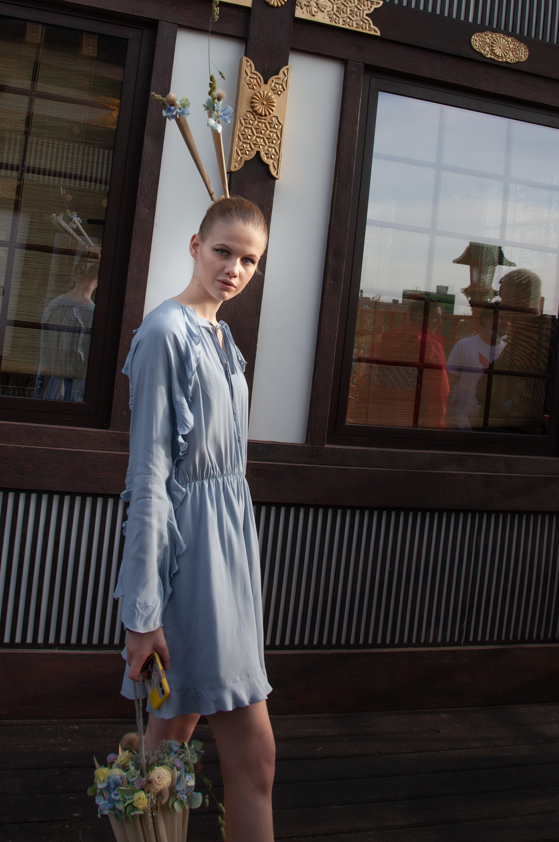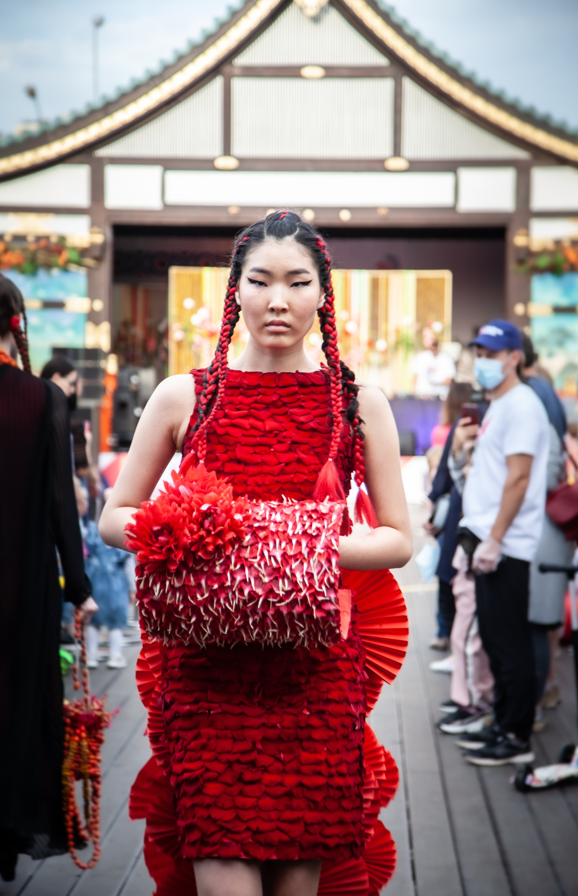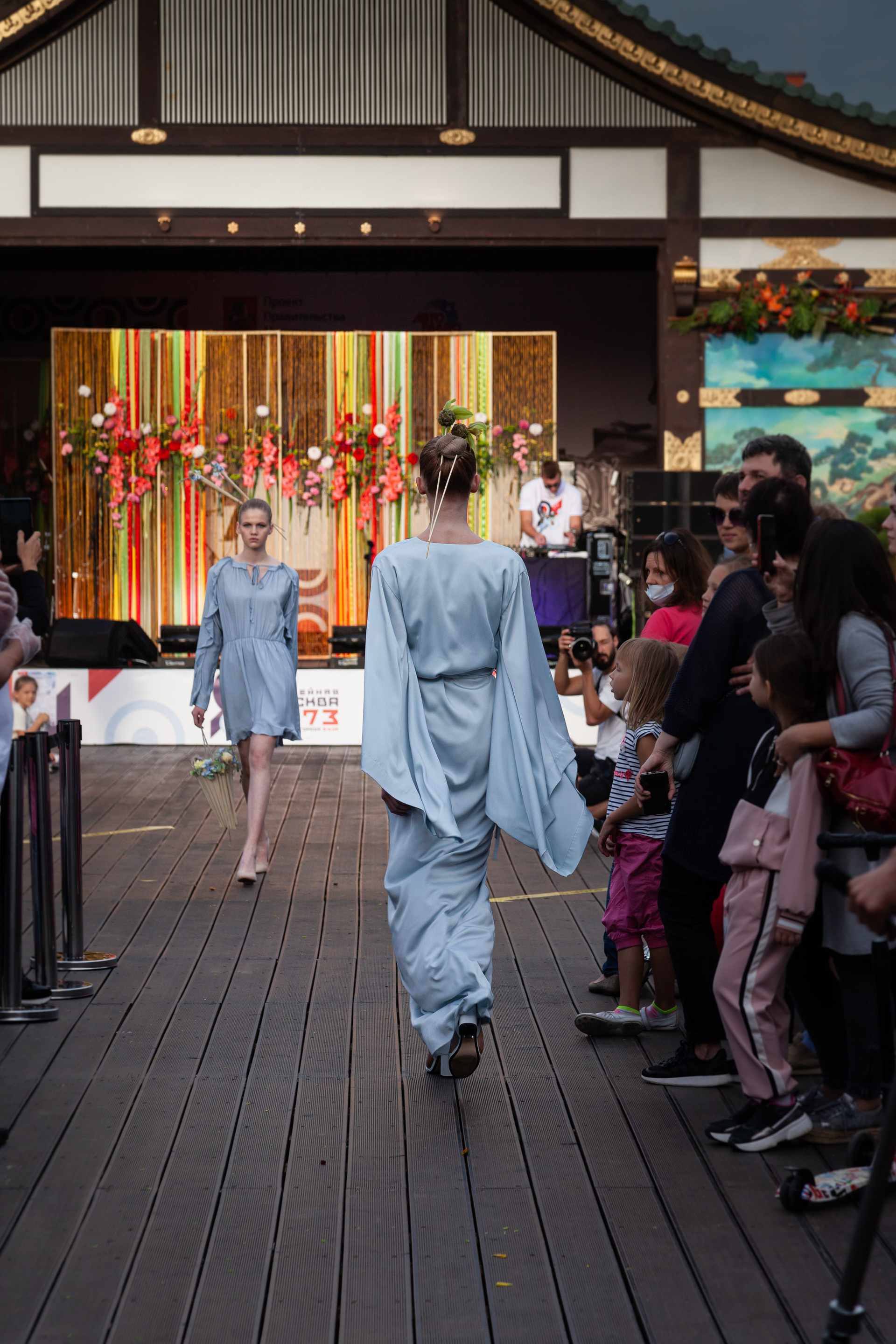 This setting became a natural extension of the concept. The floral compositions echoed the visual language of Eastern aesthetics: layered, asymmetrical, and deeply connected to the idea of harmony between human creation and nature. Against this backdrop, the contemporary silhouettes by Artem Krivda created a subtle contrast — structured, modern, and intentionally restrained.